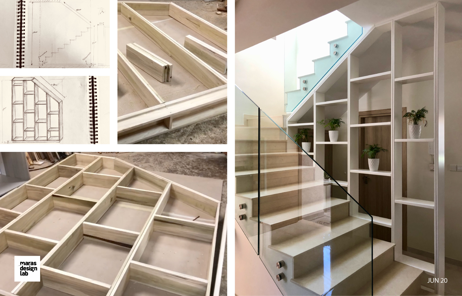 Commissioned to design, make and install a diagonal shelf next to a staircase with some shelfs extend stair-steps. Collaborating and working with A. Iliadis at his workshop we created a furniture with poplar wood suitable to be finished with white mat paint. it was a great challenge to make it and install it due to its diagonal sides. Great outcome with another one satisfied client.